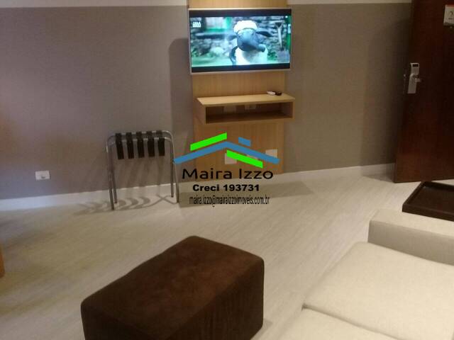 Flat 1 dormitório, sendo 1 suíte, decorado, cozinha americana equipada com utensílios básicos, ar condicionado, cama de casal, armário embutido na suite, armário planejado na cozinha, sala com móveis e TV LCD, iluminação, varanda mobiliada com vista livre.